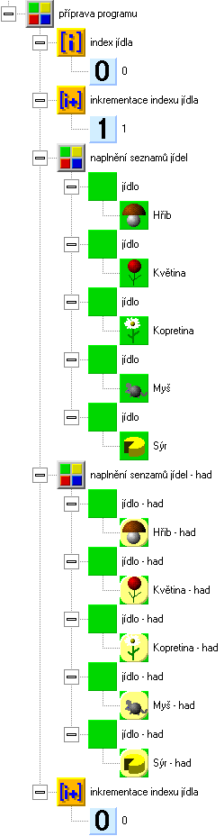 Nejdříve naplníme předmět jídlo na všech stránkách seznamu. Postupně nastavujeme prvek jídlo na jednotlivé předměty jídla. Předměty se ukládají do seznamu a po každém nastavení předmětu se stránka automaticky zvýší o jedničku. Po nastavení posledního předmětu se ukazatel stránek automaticky převine na začátek (tím že přeteče přes konec). Začneme plnit předměty jídlo - had, opět se stránky samy zvyšují nahoru. Na závěr nastavíme automatické zvyšování stránek na hodnotu 0, protože v programu již automatické zvyšování nebudeme používat.