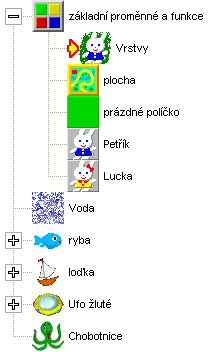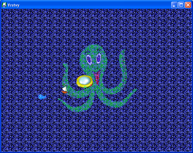 Pro demonstraci práce s vrstvami si vytvoříme malý ukázkový prográmek. Nazvěte ho třeba Vrstvy. Grafiku si sice můžete připravit sami, ale pokud se vám nechce, v závěru kapitoly jsou ke stažení potřebné grafické prvky. Budeme potřebovat: sprajt ryby, sprajt loďky a sprajt UFO. K tomu ještě obrázek chobotnice. No a nakonec - předmět s vodní hladinou.