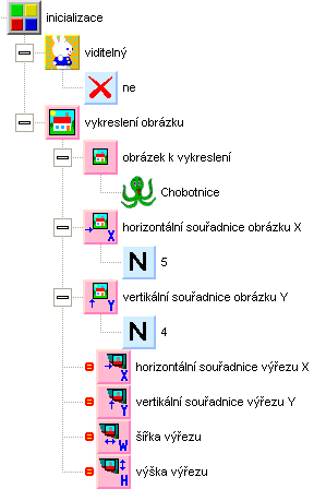 Začneme inicializací. Sprajt Petříka nebudeme potřebovat, můžete ho proto vypnout nastavením viditelnosti na ne. Takto budeme začínat i u většiny následujících programů, protože Petříka využíváme spíš jen u políčkové grafiky. Dalším příkazem zajistíme vykreslení obrázku chobotnice na souřadnicích X=5 a Y=4. Příkaz naleznete ve skupině grafika - kreslení. Vztažným bodem obrázků je jejich levý dolní roh.