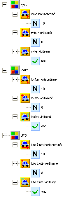 Sprajty upravte v nastavení tak, aby ryba měla počet fází na krok 4, výškovou hladinu -100, loďka počet fází na krok 8, výškovou hladinu 0 a UFO počet fází na krok 16 a výškovou hladinu 100. UFO se tedy bude pohybovat nejpomaleji a v nejvyšší výšce, loďka bude nejpomalejší a ve střední výšce (na hladině moře), ryba bude nejníže, pod mořskou hladinou.