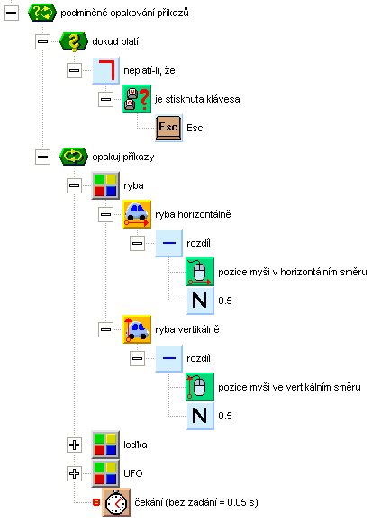 Budeme pokračovat hlavní smyčkou programu. Použijte cyklus Podmíněné opakování příkazů. Do podmínky uveďte test, zda není stisknuta klávesa Esc. Smyčka se tedy bude opakovat tak dlouho, dokud uživatel nestiskne klávesu Esc, tím se program ukončí. Vše, co smyčka dělá, je opakované nastavování souřadnic sprajtů podle aktuální souřadnice kurzoru myši. Sprajty tedy sledují kurzor myši. Rozdíl mezi obsluhou jednotlivých sprajtů je pouze v tom, že sprajty mají různé rozměry. Vzhledem k tomu, že chceme nastavovat střed sprajtů, musíme přičítat různou korekci, která odpovídá polovině rozměru sprajtu. Na závěr smyčky uveďte příkaz pro čekání (nemá smysl, aby smyčka běžela plnou rychlostí).
