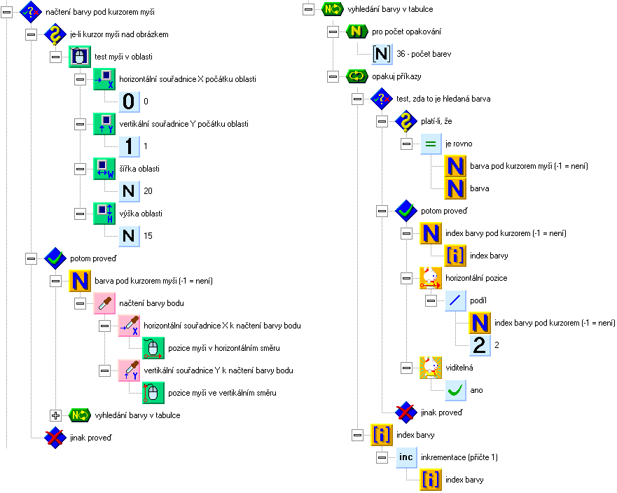 Po načtení bodu se pokusíme barvu vyhledat v tabulce barev. Cyklus vyhledání barvy vidíte na obrázku vpravo. Cyklus prochází celou tabulku barev, každou barvu porovnává se zjištěnou barvou pod kurzorem. Nalezne-li odpovídající barvu, uschová její index do proměnné index barvy pod kurzorem, nastaví Lucku (jako indikátor barvy pod kurzorem) nad okénko s barvou a zapne viditelnost Lucky.