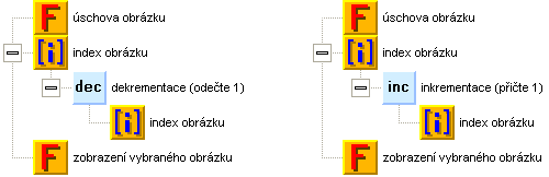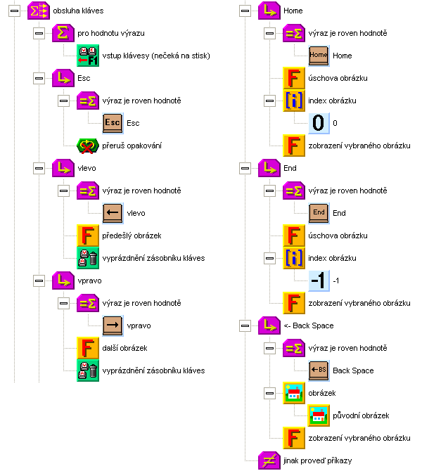V druhé větvi obsloužíme klávesu vlevo. V obsluze větve uveďte funkci předešlý obrázek, předtím funkci vytvořte (zatím prázdnou). Podobně obsloužíme klávesu vpravo, jen použijeme funkci další obrázek. Za funkce uveďte příkaz vyprázdnění zásobníku kláves. Klávesy mohou být generovány rychleji než je rychlost průchodu hlavní smyčkou, program by měl při listování setrvačnost, což není příjemné.