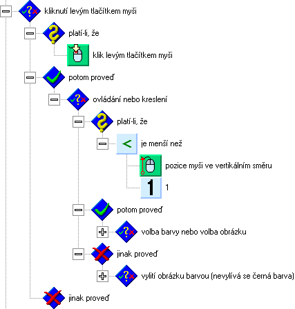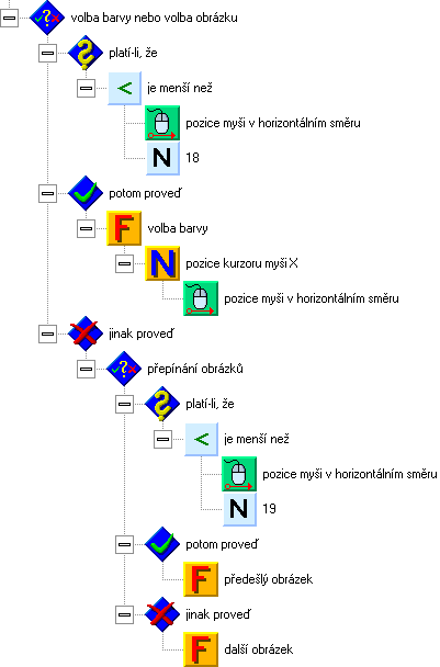 Nyní vytvoříme obsluhu ovládání myší. Do hlavní smyčky za obsluhu kláves přidejte podmíněný příkaz s názvem kliknutí levým tlačítkem myši. Do testu podmínky vložte prvek klik levým tlačítkem myši. Je to logický příznak a je nastaven vždy, když uživatel klikne levým tlačítkem myši do okna programu. Vypnutí příznaku se provede jeho čtením, například použitím v podmínce. Proto budete-li někdy chtít příznak testovat vícekrát, musíte si ho uschovat v logické proměnné.