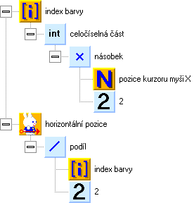 Ve funkci převezmeme hodnotu vstupní proměnné, vynásobením číslem 2 souřadnici převedeme na číslo barvy, funkcí celočíselná část odstraníme nepotřebnou desetinnou část a výsledek použijeme k nastavení nového indexu barvy. Nastavíme horizontální souřadnici Petříka na poloviční hodnotu indexu barvy, což odpovídá souřadnici okénka s barvou. Petříka v programu používáme jako indikátor vybrané barvy. Jeho vertikální souřadnice zůstává trvale nastavena na 0, proto si jí nemusíme všímat.