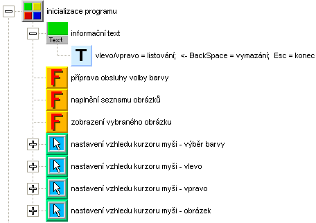 Ve skupině inicializace programu určíme pomocí příkazů nadefinování vzhledu kurzoru myši, jaký vzhled ve které části okna bude kurzor myši mít. Pro pole výběru barvy nadefinujeme kapátko, pro ovládací tlačítka šipky vlevo a vpravo, pro plochu obrázku kurzor výplně.