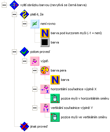 Nyní obsloužíme případ, kdy uživatel kliknul levým tlačítkem myši do oblasti obrázku. Základem obsluhy bude podmíněný příkaz vylití obrázku barvou (na dalším obrázku). V testu podmínky ověříme, zda pod kurzorem myši není černá barva. Černou barvu používáme pro obrysy obrázků a nesmíme ji vylít. Barvu pod kurzorem myši jsme si uschovali do pomocné proměnné na začátku hlavní smyčky programu.