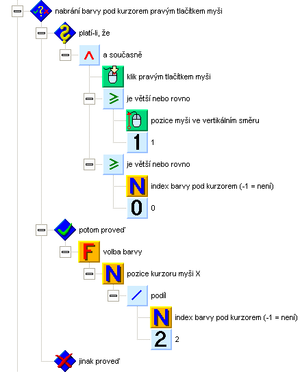 Za podmíněným příkazem pro načtení barvy následuje podmíněný příkaz zajišťující vypnutí indikátoru barvy, není-li pod kurzorem myši platná barva. To může nastat nejen v případech, kdy je kurzor myši mimo plochu obrázku, ale také je-li pod kurzorem myši černá (nebo nějaká neznámá) barva.