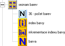 Nejdříve naplníme seznam barev. Nastavte index barvy na 0 a inkrementaci indexu barvy na 1. Tím zajistíme, že se barvy budou do seznamu ukládat od začátku a po každém nastavení barvy se ukazatel seznamu automaticky zvýší o 1. Následují příkazy nastavení barev. Zvolte 36 barev dle vlastního výběru (ne černou, tu používáme pro obrysy). Proč zrovna 36? Pro volbu barvy budeme mít k dispozici 18 políček a na každém políčku budou 2 barvy.