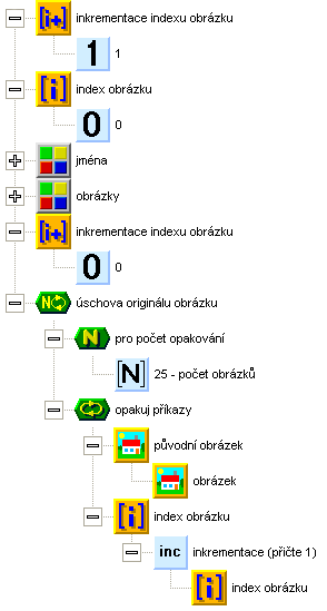 Naplňte seznam obrázků ve funkci naplnění seznamu obrázků. Klasickým způsobem - nastavením inkrementace indexu obrázku na 1, naplněním seznamu jmen obrázků (podle jmen souborů) a naplněním obrázků v seznamu vzory obrázků načtenými z knihovny. Mezi plněním jmen obrázků a obrázků není třeba nulovat index obrázku, nuluje se automaticky přetečením přes konec. Poté ještě pomocí cyklu uchovejte obrázky do proměnné původní obrázek. Protože přistupujeme ke 2 položkám seznamu, nemůžeme použít automatickou inkrementaci a musíme používat programové zvyšování indexu.