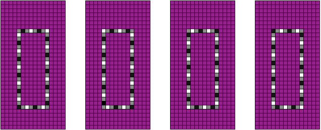 V programu budeme používat Petříka jako indikátor, která barva je právě zvolená. Vyvolejte editaci sprajtu Petříka. Změňte parametry sprajtu na následující hodnoty: prodleva mezi fázemi = 110, fází na krok = 0, fází pro klid = 4, fází pro pohyb = 0, směrů = 1, šířka obrázku = 0.5. Vyhoďte obrázky Petříka ze sprajtu a dvojklikem do prvního obrázku vyvolejte editaci obrázku. Do obrázku nakreslete rámeček indikátoru, využijte střídající se barvy bílá-šedá-černá-šedá. Zkopírujte obrázek do dalších políček sprajtu a posuňte body vždy o 1 bod ve směru hodinových ručiček. Při zkoušce sprajtu uvidíte, jak rámeček "teče" po obvodě.