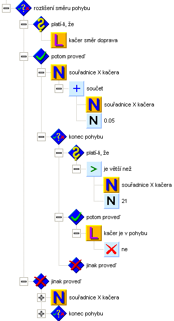 Je-li kačer v pohybu, zajistí se jeho pohyb změnou souřadnice X v závislosti na tom, kterým směrem se pohybuje. Pohybuje-li se směrem doprava, jeho X souřadnice se zvýší o 0.05. Pokud souřadnice X přesáhne hodnotu 21 (stačilo by i 20), kačer se dostal mimo obrazovku a vypne se příznak pohybu. Od této chvíle je neaktivní a může být znovu vyvolán. Obdobně se zajistí obsluha pro směr zprava doleva s tím rozdílem, že od souřadnice X se odečítá 0.05 a kontroluje se spodní hranice -5 pro ukončení animace (obrázek je 4 široký, 1 je rezerva).