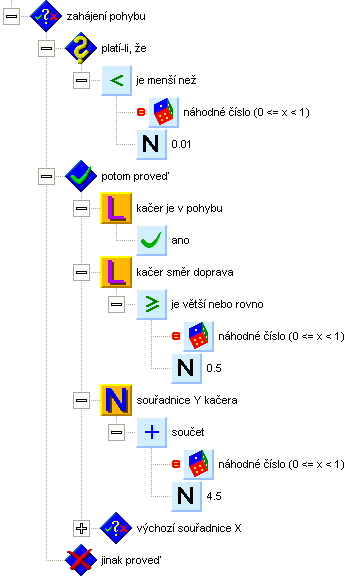 Není-li kačer v pohybu, může se zahájit jeho nová animace. Animace se spustí s pravděpodobností 1% (tj. náhodné číslo je menší než 0.01). Při zahájení pohybu se nejdříve nastaví příznak, že kačer je v pohybu. Dále se náhodně určí (s 50% pravděpodobností), zda se bude pohybovat zleva doprava nebo obráceně. Souřadnice Y bude náhodná v rozmezí 4.5 až 5.5. Obrázek kačera má výšku 1.5, při souřadnici 5.5 bude tedy jeho horní okraj na souřadnici 7.0, což je horní okraj hladiny. Pokud bychom kačera nechali zobrazovat výše, museli bychom překreslovat i obrázek pozadí, jinak ho bude kačer přemazávat.