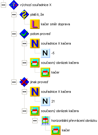 Podle příznaku směru pohybu určíme výchozí souřadnici X kačera - buď -5 (vlevo) nebo 21 (vpravo). Zároveň připravíme současný obrázek kačera. Pro směr doprava je to původní obrázek beze změny, pro směr doleva je to obrázek zrcadlově obrácený.