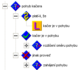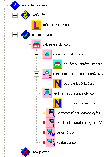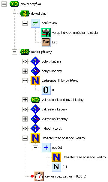 Cyklus kreslení hladiny na chvíli opustíme a budeme se věnovat animaci kačera a kachny. Na začátek hlavní smyčky přidejte podmínku pohyb kačera. Podle přepínače kačer je v pohybu se rozliší dva případy - buď je kačer v pohybu a je třeba jej animovat nebo je mimo obrazovku a může být znovu přivolán na scénu.