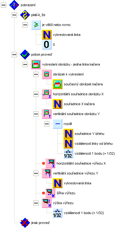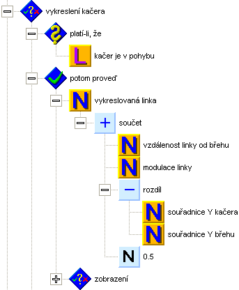 Vrátíme se do smyčky vykreslení jedné fáze hladiny. Doplňte za příkaz pro vykreslení jedné linky hladiny podmínku, která vykreslí kačera v případě, že kačer je v pohybu (tj. zobrazen). Nejdříve si připravíme souřadnici linky v obrázku kačera - od vzdálenosti linky od břehu odečteme vzdálenost obrázku kačera od břehu. Namísto dvojité negace jen zaměníme prvky, takže odečteme souřadnici Y kačera mínus souřadnici Y břehu. K výsledku přičteme vypočtenou modulaci linky, čímž zajistíme vlnění hladiny, a malou korekci 0.5, která zajistí, že se obraz kačera zobrazí kousek výše (aby se s kačerem mírně překrýval).