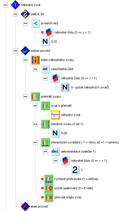 Zbývá poslední úkon - náhodné přehrávání zvuků. Obsluhu umístěte do hlavní smyčky, před obsluhu čekání. Nový náhodný zvuk se přehraje s 2% pravděpodobností, tj. je-li náhodné číslo menší než 0.02. Nastavením indexu náhodného zvuku na náhodné číslo se náhodně vybere některý ze zvuků a spustí se jeho přehrátí s náhodným vyvážením stereobáze v rozsahu -1 až +1. Tím je program hotov.