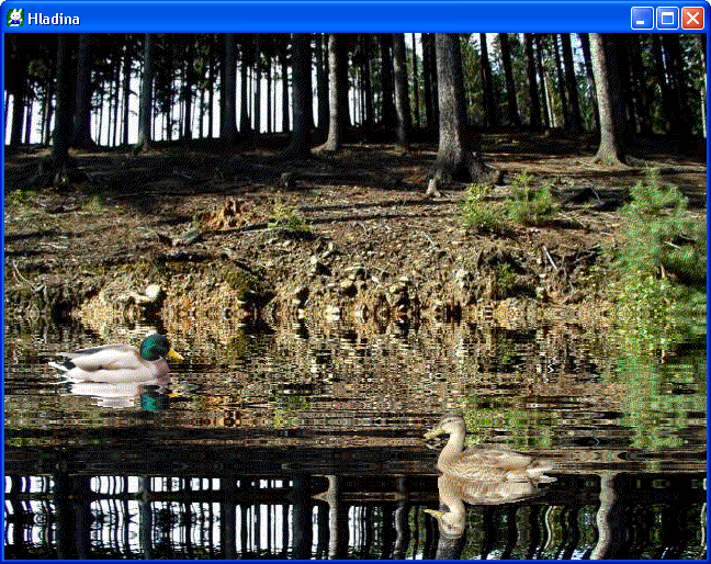 Program můžete opět vyzkoušet. Pod kačerem by se měl objevit jeho vlnící se odraz ve vodě. Obdobně obslužte i kreslení kachny. Kreslení kachny musí probíhat vždy později než kreslení kačera, protože její Y souřadnice je níže, tedy jakoby blíže k nám.