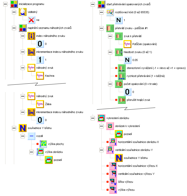 Dále v inicializaci spustíme přehrávání opakovaných zvuků zvukové kulisy scény (šumění vody, zpěv ptáků). U zvuků se musíme zastavit podrobněji. Chceme, aby zvuky zněly pestře a náhodně. Proto nestačí abychom si připravili jednu dlouhou nahrávku - neměli bychom ji dostatečně dlouhou a velmi brzy bychom narazili na opakování, kdy se nahrávka už stává nudnou. Pestrost proto musíme zajistit opakováním více zvuků najednou s tak rozdílnými délkami, aby se nahrávky opakovaně nesetkávaly.