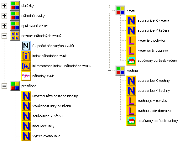 Kromě uvedených proměnných si připravte ještě proměnné pro kreslení kačera a kachny. Prvky souřadnice X kačera a souřadnice Y kačera představují souřadnice obrázku kačera v okně. Příznak kačer je v pohybu indikuje, že kačer je viditelný a pluje po hladině. Příznak kačer směr doprava udává, zda kačer pluje zleva doprava nebo obráceně. Prvek současný obrázek kačera je obrázek kačera buď v původním tvaru (zleva doprava) nebo zrcadlově obrácený (zprava doleva). Obdobné proměnné jsou pro kachnu.
