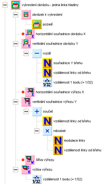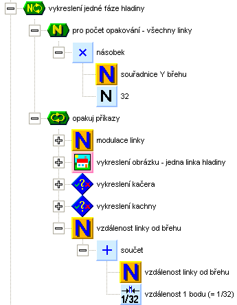 Do počtu opakování cyklu vložte souřadnici Y břehu vynásobenou číslem 32. Jak si jistě vzpomínáte, jednotkový krok v souřadném systému Petra představuje šířku 1 políčka. Každé políčko (předmět) má rozměr 32 x 32 grafických bodů. Proto vynásobením souřadnice Y břehu číslem 32 získáme počet grafických linek hladiny, kterou chceme kreslit.
