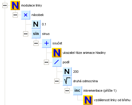 Funkce bude modulovaná sinusovou funkcí (jak by se dalo u vln na hladině očekávat). Vynásobením koeficientem 0.1 uvedeme rozkmit vln do "rozumných" mezí. Argument funkce sinus bude záviset jednak na fázi animace - tím se zajistí pohyb vln v čase - a jednak na vzdálenosti od břehu - tím se zajistí zvlnění hladiny od břehu směrem k nám. Ukazatel fáze animace hladiny můžeme jednoduše přičíst k funkci závislosti na vzdálenosti od břehu.