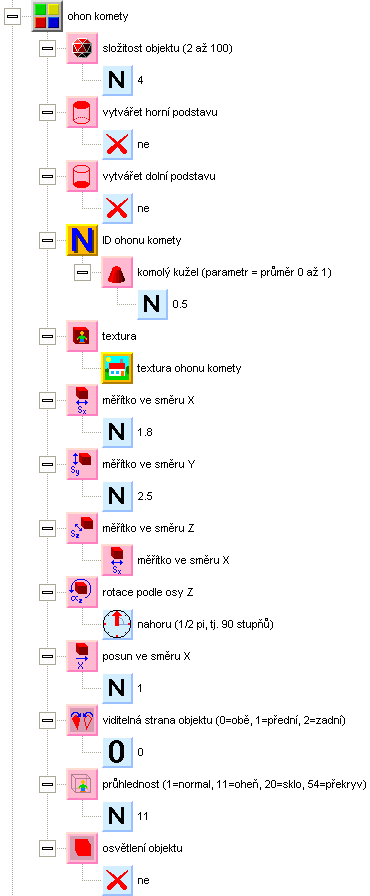 Opět se vrátíme k našemu minulému programu se Zemí. Naše kometa se bude skládat ze 4 objektů. Prvním je samotné tělo komety, což je obyčejná koule. Pak bude mít ohon, což bude komolý kužel pokrytý průhlednou texturou. Zvýšíme efekt tím, že kometa bude osvětlovat okolní objekty. Toho docílíme vytvořením objektu světla a jeho připojením ke kometě. A to vše bude sloučeno do jedné společné skupiny.