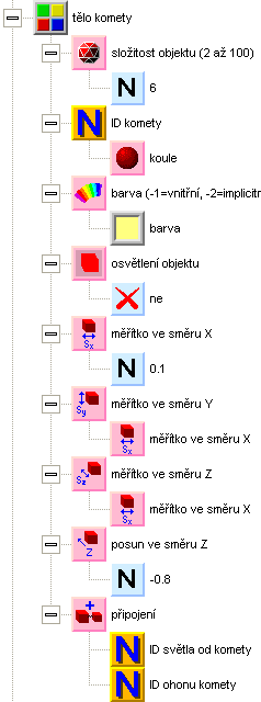Dalším objektem bude vlastní tělo komety. Bude to opět koule. Její složitost nastavíme na 6. Barvu na jasně žlutou a osvětlení vypnuté, ze stejného důvodu jako u ohonu. Velikost zvolíme 0.1. Posunutím na -0.8 ve směru Z zajistíme potřebnou výšku komety nad povrchem Země. K tělu komety připojíme objekt světla od komety a objekt ohonu komety.