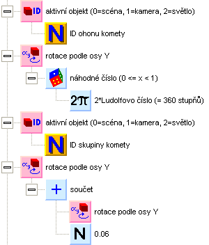 A ještě nakonec musíme kometu rozhýbat. Ohon budeme animovat tak, že budeme jednoduše náhodně nastavovat rotaci kolem osy Y, čímž zajístíme náhodné blikání jisker v ohonu komety. Celou skupinou komety budeme otáčet kolem osy Y podobně jako s Měsícem, jen rychlost zvolíme 0.06.