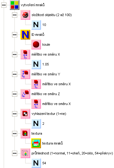 Dále potřebujeme číselný prvek ID mraků. Objekt mraků vytvoříme v samostatné skupině vytvoření mraků předtím, než vytvoříme objekt Země. Podobně jako u Země, nejdříve zvolíme složitost objektu 10, vytvoříme objekt mraků jako kouli a nastavíme měřítko ve všech směrech na 1.05, čili mraky budou mírně nad povrchem Země. Poznamenejme, že všechny objekty se vytváří s rozměry 1. Dále nastavíme texturu mraků a zvolíme průhlednost číslo 54. Tento typ průhlednosti používá alfa kanál textury, což znamená průhlednou barvu. Body vyplněné průhlednou barvou zůstanou průhledné, ostatní body budou viditelné.