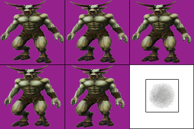 Budete-li si připravovat textury minotaura, použijte velikost 256 x 256 bodů a okolí minotaura vyplňte průhlednou barvou. Nebo můžete použít textury, které naleznete na konci lekce. Kromě minotaura si připravíme ještě i texturu stínu pod minotaurem, což je bílá plocha s šedým flíčkem uprostřed.