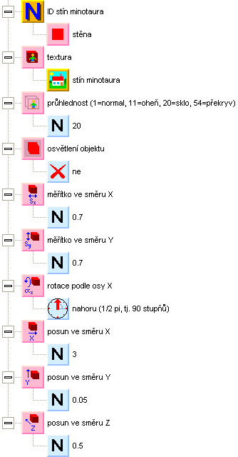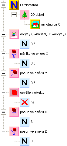 Připravte si funkci vytvoření minotaurů a zavolejte ji během inicializace programu. Zatím jen jako první pokus vytvoříme jednoho minotaura na nějaké pozici blízko nás. ID objektu uložíme teď jen do prozatimní proměnné. Nastavením prvku obrysy na hodnotu 0.8 zajistíme, že místa s průhlednou barvou budou průhledná. U minotaura můžeme vypnout osvětlení objektu, protože obrázek je už nastínován a po ztmavení by působil nepřirozeně.