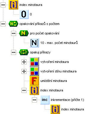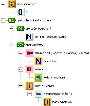Zpět k funci vytvoření minotaurů. Minotaury budeme vytvářet v cyklu pro všechny prvky seznamu. Nejdříve vytvoříme minotaura, stejně jako jsme to udělali zkušebně před chvílí, jen vypustíme příkazy pro nastavení souřadnice X a Z. Dále vytvoříme stín, opět stejně a opět bez nastavení souřadnic X a Z. Posledním příkazem ve smyčce bude zavolání funkce umístění minotaura, která vygeneruje novou náhodnou pozici minotaura. Zatím funkci nemáme, proto ji založte.