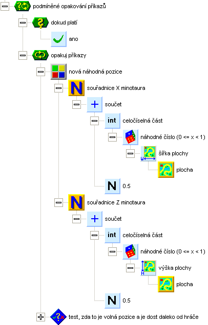 V obsluze funkce umístění minotaura budeme v nekonečné smyčce hledat náhodnou volnou pozici pro vybraného minotaura. Nejdříve vygenerujeme náhodnou souřadnici. Bude to náhodné číslo odvozené z rozměrů plochy, s hodnotami 0.5, 1.5, 2.5 atd.