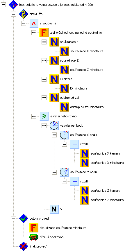 Po vygenerování náhodných souřadnic otestujeme novou pozici, zda je volná. To znamená, musí tam být prázdné políčko a nesmí tam být žádný jiný aktér (test aktérů budeme mít až později). Funkci pro test průchodnosti předáváme ID minotaura (kvůli testu kolize aktérů) a odstup od zdi minotaura. Odstup od zdi minotaura je konstanta, kterou si připravte ve společných proměnných, její hodnotu nastavte v inicializaci na 0.4. Další testovanou podmínkou bude, že nová pozice musí mít určitou minimální vzdálenost od kamery. To je z toho důvodu, aby se po zastřelení příšery neobjevila nová hned u hráče, to by jistě nevypadalo moc dobře. Jsou-li všechny podmínky splněny, aktualizuje se nová souřadnice minotaura zavoláním funkce aktualizace souřadnice minotaura. Tu zatím nemáme, připravte si prázdnou. Poté se smyčka přeruší. Nejsou-li podmínky splněny, pokračuje se v hledání na nové náhodné pozici.