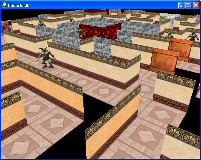 Program spusťte a projděte se po bludišti. Měli byste nacházet roztroušené minotaury. Je jich sice jen jako šafránu, ale až vás budou kousat bude jich až moc. Chcete-li si udělat přehled, změňte na chvíli v inicializaci výšku kamery Y na hodnotu např. 3 a přidejte rotaci X s hodnotou 0.5. Uvidíte bludiště s minotaury z nadhledu.
