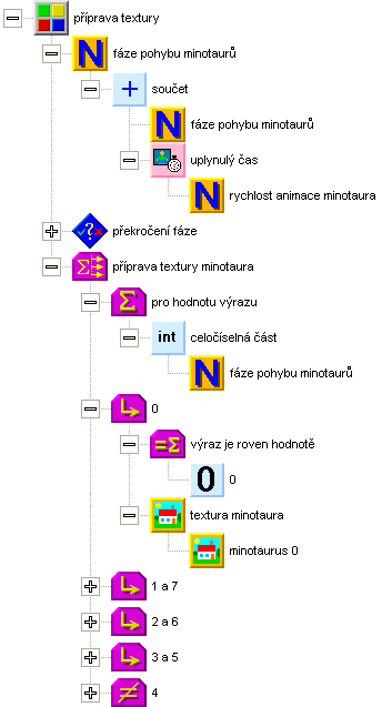 Minotaury rozhýbeme. Založte novou funkci, obsluha minotaurů, a přidejte její volání do hlavní smyčky programu, za obsluhu klávesnice. Nejdříve budeme animovat pohyb. Připravte si proměnnou fáze pohybu minotaurů. Dále potřebujeme konstantu rychlost animace minotaura, její hodnotu nastavte v inicializaci na 6. V obsluze minotaurů zvýšíme čítač fáze pohybu minotaurů a to opět s využitím čítače uběhlého času a konstanty rychlosti animace minotaura. Pokud proměnná fáze přeteče přes maximální hodnotu, což je v našem případě 8 (animace má 8 fází), odečteme 8 a tím posuneme čítač opět na začátek. Mohli bychom čítač vynulovat, ale tím bychom mohli dosáhnout nerovnoměrnou délku první fáze animace. Podle celočíselné části fáze pohybu si připravíme příslušnou texturu. Uchováme si ji do proměnné textura minotaura, kterou jsme si pro ten účel připravili v místních proměnných funkce. Mohli bychom pro každého minotaura použít jiný ukazatel fáze, aby se nepohybovali stejně, ale máme jich ve scéně málo a je poměrně nízká pravděpodobnost výskytu více minotaurů viditelně blízko sebe.