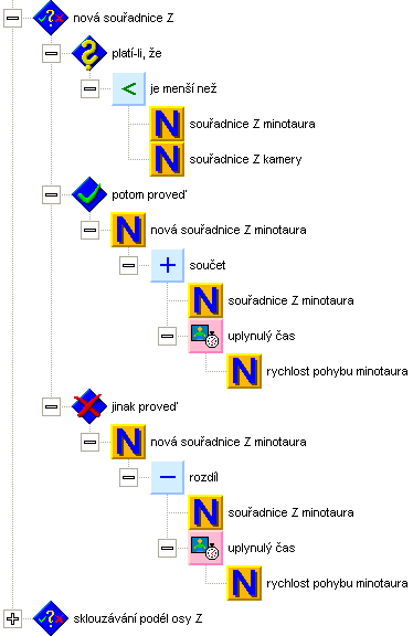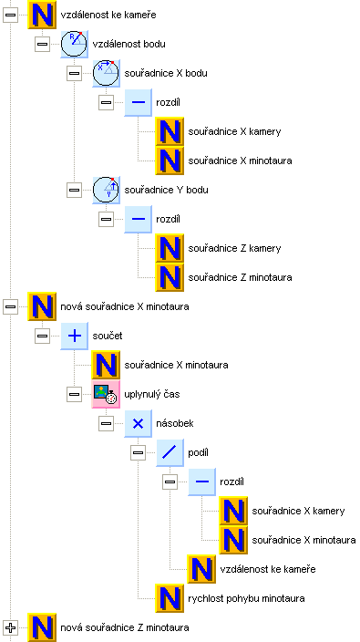 Do stejné smyčky, kde nastavujeme texturu minotaura, začneme doplňovat pohyb minotaura. Nebude oplývat žádnou zvláštní inteligencí. Koneckonců, co byste čekali od příšery. Takže se bude jen snažit jít pomalu co nejkratší cestou k hráči. To zajistíme následující metodou. Z rozdílů souřadnic kamery a minotaura vypočteme vektor směru k hráči. Ten normalizujeme (tj. vydělíme jeho délkou) a vynásobíme rychlostí pohybu minotaura korigovanou uplynulým časem. Konstantu rychlost pohybu minotaura si pro ten účel připravíme ve společných proměnných a nastavíme jí hodnotu 0.1. Přičtením násobku k aktuální pozici získáme novou pozici minotaura. Výsledek si uložíme do přechodných lokálních proměnných nová souřadnice X a Z minotaura.