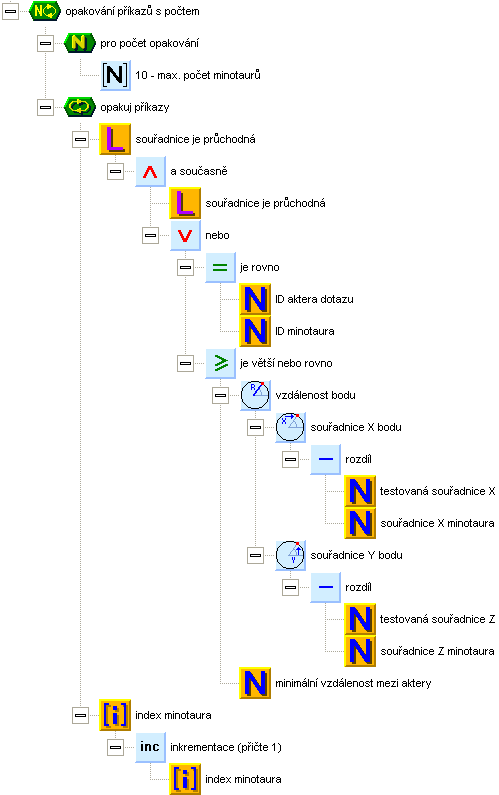 Podobně budeme testovat kolizi s minotaury. Projdeme seznam všech minotaurů a ověříme, zda je tazatelem dotyčný minotaurus nebo zda je vzdálenost dostatečně velká. Pozor však na to, že funkce je volána z funkcí, které procházejí seznam minotaurů. To znamená, že po návratu z funkce musí index v seznamu minotaurů ukazovat na stejnou pozici. Proto se index v seznamu nenastavuje na výchozí hodnotu a seznam se prochází úplně celý (celý se jednou projede), i kdyby byl výsledek testu už jasný. Tím se zajistí neporušenost indexu. Raději bychom si měli k funkci do poznámky připsat na to upozornění.