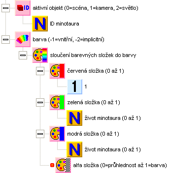 Zdraví minotaura budeme indikovat tím, že s ubývajícím zdravím bude získávat červenou barvu. Proto vytvořte novou funkci, aktualizace barvy minotaura. Červenou složku barvy minotaura necháme stále na maximu, zatímco modrou a zelenou složku budeme měnit podle hodnoty života. Volání funkce doplňte do funkce umístění minotaura, za inicializaci zdraví minotaura na 1.