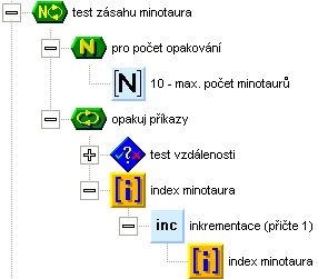 Budeme pokračovat ve funkci obsluha střel a výbuchů. Připravte lokální proměnnou účinnost zásahu minotaura. Do obsluhy střel, za podmínku zásahu do zdi, doplňte cyklus test zásahu minotaura. V cyklu budeme procházet seznam minotaurů a testovat, zda střela dosáhla blízkosti minotaura.
