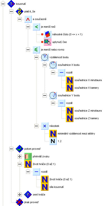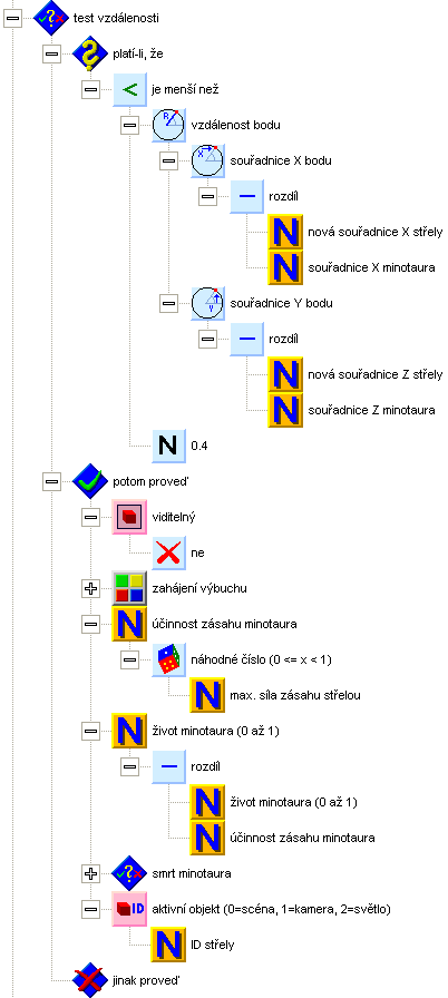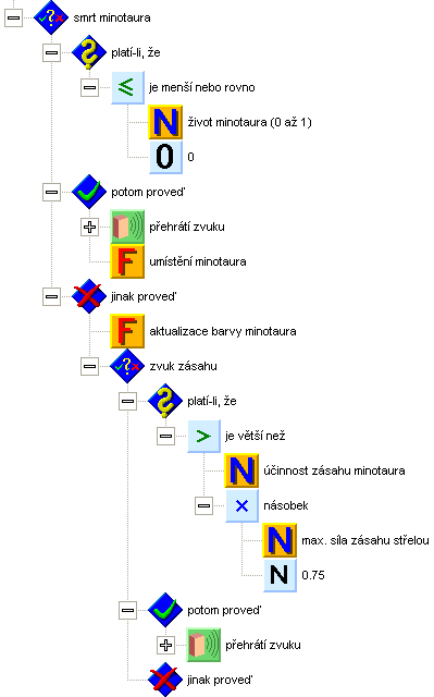 Přiblíží-li se střela dostatečně blízko k minotaurovi (zvolili jsme vzdálenost 0.4), bude se jednat o zásah. Vypneme viditelnost střely a zahájíme zobrazení výbuchu. Jednoduše zkopírujte skupinu zahájení výbuchu z obsluhy nárazu střely do zdi. Vygenerujeme účinnost zásahu minotaura jako náhodné číslo od nuly po maximální sílu zásahu. Hodnotu odečteme od života minotaura. Po obsluze případné smrti minotaura musíme znovu vybrat ID střely, kvůli další obsluze střely.
