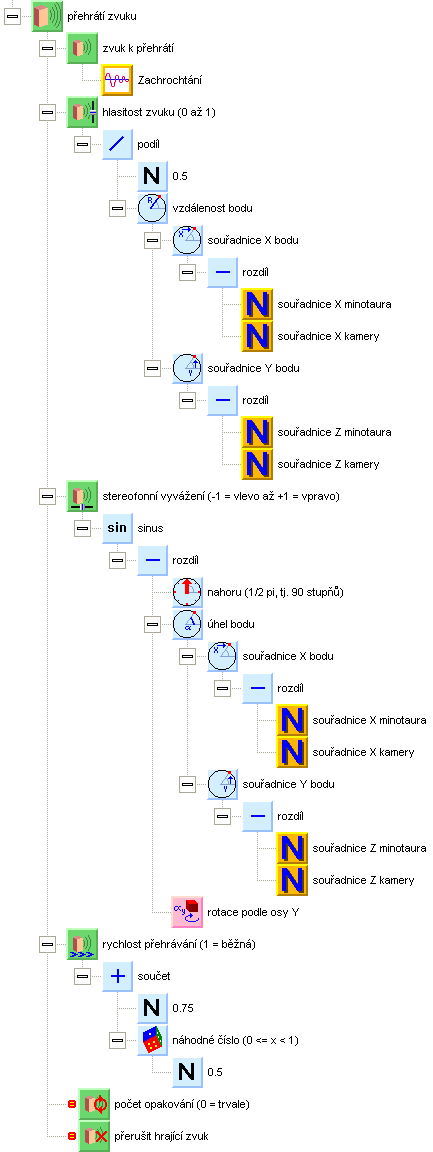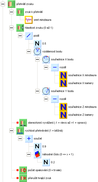 Smrtelný výkřik minotaura přehrajeme tak, že hlasitost ubývá s rostoucí vzdáleností. Navíc budeme měnit náhodně rychlost přehrávání, aby zvuk nezněl stále stejně. Podobně přehrajeme i zvuk při zásahu minotaura, jen použijeme jiný zvuk.