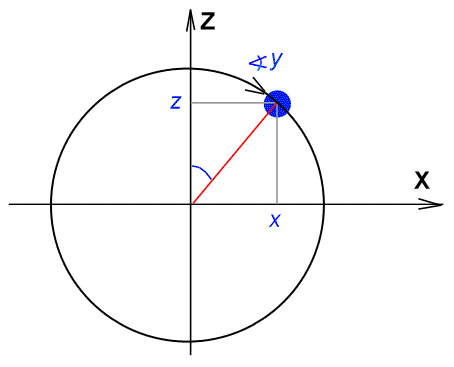 Při pohybu vpřed a vzad vycházíme z nákresu podle následujícího obrázku. Jedná se o pohled na terén shora. Směr otočení kolem osy Y znamená otočení kolem svislé osy ve směru hodinových ručiček, přičemž nulový směr je ve směru kladné osy Z. Požadovanou vzdálenost jednoho úseku kroku vypočteme vynásobením uplynulého času konstantou rychlosti pohybu. Změnu souřadnice X poté zjistíme vynásobením úseku kroku funkcí sin úhlu otočení. Změnu souřadnice Z zjistíme vynásobením úseku kroku funkcí cos úhlu otočení.