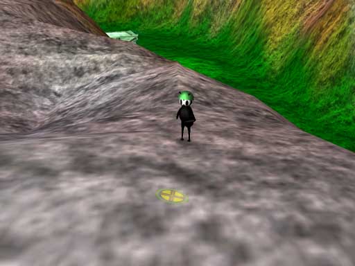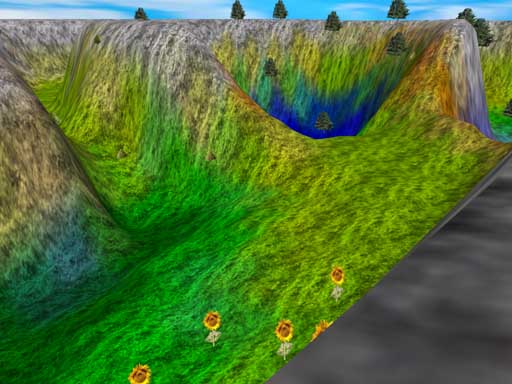 Aby zaměřovací kříž působil trochu zajímavěji a byl v terénu dobře patrný, zajistíme jeho animaci pomalým otáčením kolem osy Y. Vypnutím hloubkového testu zajistíme, že se kříž bude vykreslovat vždy a tak ho můžeme položit přesně na úroveň terénu (jinak by se s terénem prolínal a byl občas vidět a občas ne). Dále je dobré zajistit, aby kříž sledoval sklon terénu, tj. jakoby po terénu plaval. To zajistíme tím, že kříž budeme naklánět podle os X a Z. Pro každý ze směrů vypočteme sklon terénu tak, že zjistíme výšku terénu v bodech vychýlených o malý kousek od paprsku. Úhel, který svírá terén s vodorovnou rovinou, pak vypočteme z rozdílů výšek a vzdálenosti testovacích bodů prvkem úhel bodu. Vzdáleností testovacích bodů můžeme určovat plynulost přechodu sklonu kříže přes zlomové hrany terénu - čím bude vzdálenost větší, tím bude kříž přecházet přes hrany plynuleji.