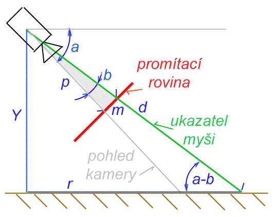 Situaci při vykreslování 3D grafiky si můžeme představit tak, jakoby před pohledovou kamerou byla umístěna skleněná deska, na kterou probíhá promítání scény. Této desce říkáme promítací rovina. Při pohybu myší po obrazovce můžeme vést z kamery ukazatelem myši pomyslný paprsek protínající promítací rovinu a rovinu terénu. Umíme vypočítat relativní pozici myši m vzhledem ke středu obrazovky (od souřadnice myši odečteme střed obrazovky a vydělíme zprůměrovaným rozměrem plochy). Relativní pozice myši m odpovídá úseku, o který je paprsek myši vzdálen od středového paprsku v místě promítací roviny. Známe vzdálenost promítací roviny p (máme na to ve 3D grafice prvek), takže máme všechny údaje a můžeme vypočítat úhel b, který svírá paprsek myši se středovým paprskem ve vertikálním směru. Můžeme k tomu použít funkci Petra úhel bodu, m bude souřadnicí x a p souřadnicí y.