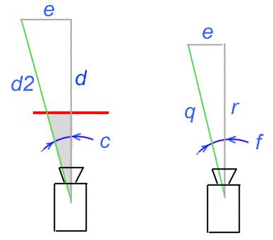 Podobně, jako jsme počítali úhel paprsku myši ve vertikálním směru, spočítáme úhel paprsku myši c v horizontálním směru. Horizontální souřadnici myši přepočteme na relativní souřadnici vzhledem ke středu promítací roviny a pomocí prvku úhel bodu vypočteme úhel c. Upozorňuji, že následující levý obrázek nepředstavuje pohled shora, ale pohled kolmý k rovině ohraničené paprskem myši. Paprsek myši může totiž směřovat i např. kolmo k zemi. Na základě vypočteného úhlu c a známé pozorovací vzdálenosti d (z předešlého výpočtu) můžeme vypočítat vzálenost e, o kterou je paprsek myši vzdálen od nevychýleného paprsku v místě průsečíku s terénem - vynásobením pohledové vzdálenosti d funkcí tg úhlu c. A také vypočteme opravenou skutečnou pozorovací vzdálenost d2 - vydělením pohledové vzdálenosti d funkcí cos úhlu c.
