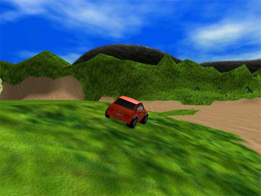 Kromě běžného sklouzávání při velkém sklonu terénu bychom měli u auta obsluhovat i zrychlení a zpomalování závislé na sklonu terénu. Ze směru otočení auta vypočteme souřadnice kousek před autem. V příkladu jsme pro jednoduchost použili jednotkovou vzdálenost testovacího bodu. Zjistíme výšku terénu jednak v testovacím bodě před autem a jednak na aktuální souřadnici auta. Rozdíl výšek vynásobíme koeficientem vlivu terénu a vzniklý údaj jíž můžeme přičíst k aktuální rychlosti, samozřejmě vynásobený uplynulým časem. Korekci provádíme až od určité minimální hraniční hodnoty, aby se auto samovolně nerozjelo na mírném svahu.