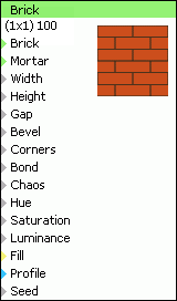 Vzorek - textový parametr určující světlost cihel v jednom vzorku. Vzorek se na zdi opakuje jako pravidelný motiv. Ke vstupu nelze připojovat jiný filtr, jeho obsah je možné měnit jen v editoru generátoru. Parametrem je seznam, jehož číselné položky představují jas cihel v rozsahu 0 až 100. Položky se navzájem oddělují čárkami. Středníkem se oddělují řádky. Výšku jednoho vzorku určuje počet řádků seznamu, šířku určuje počet položek na řádku (opakování se uplatňuje pro každý řádek zvlášť). Vzorkem nemusí být řízen jen jas cihel, ale může být použit např. k přepínání materiálu cihel.
