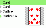 Card - číslo karty, určené hodnotou od 0 po krocích 0.01. Pořadové číslo karty = barva + hodnota*4 - 3. Barva je 0=piky, 1=srdce, 2=káry, 3=kříže. Hodnota je 1=eso, 2=dvojka, ... 13=král. K základní sadě 52 karet je doplněna karta s číslem 0, která je prázdná, a na konci (až po 100) opakující se čtveřice karet se symbolem barvy, ale bez hodnoty.